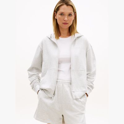 Ta bluza z mieszanki bawełny z dzianiny pętelkowej ma łatwe do rozpięcia zapięcie na zamek i swobodny krój z obniżoną linią ramion, dzięki czemu jest idealna na chwile relaksu.