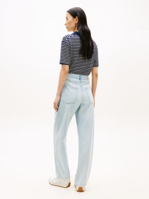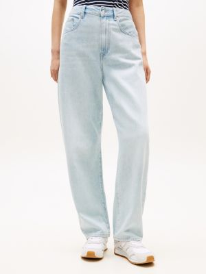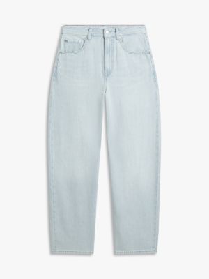 Jeansy z pełnej długości nogawkami o beczkowatym kroju i efektem wyblaknięcia na całej powierzchni przywołują klimat lat 80.