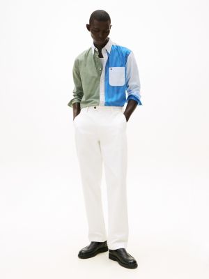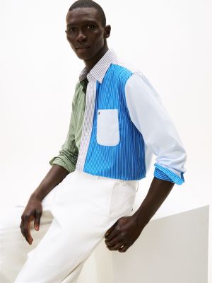 Ta przyciągająca wzrok koszula we wzór w paski z blokami kolorów, uszyta z rozciągającej się w czterech kierunkach popeliny z czystej bawełny z efektem meszku, zapewni Ci swobodę ruchów przez cały dzień.