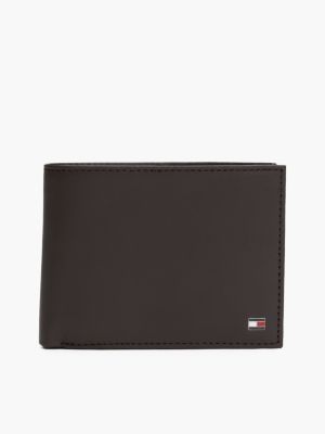 Nadruk w paski z sygnowanej tasiemki stanowi wyrazisty akcent kolorystyczny w tym składanym portfelu z gładkiej skóry.