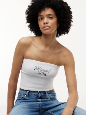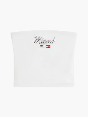 Ten top typu bandeau o wąskim kroju, ozdobiony z przodu logo wyścigu w Miami, doda Twoim stylizacjom rajdowym powabnego charakteru.