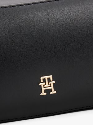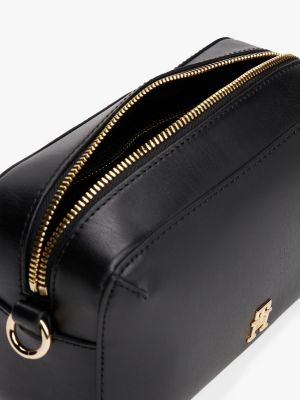 Ta torebka na aparat przyciąga wzrok wyrafinowanymi detalami z polerowanego metalu, gładkim wykończeniem i dekoracyjnym monogramem TH.