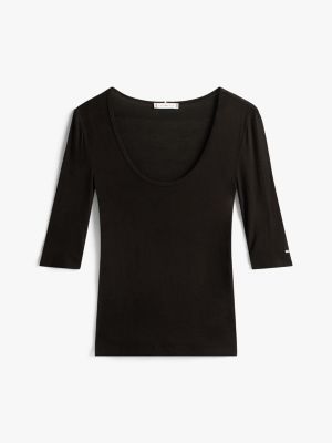 Dekolt w kształcie U i rękawy do łokcia nadają tej wąskiej koszulce z miękkiej mieszanki wiskozy kobiecy charakter.